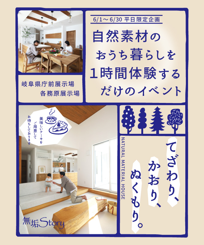 6月1日~6月30日の一ヶ月間、平日限定でモデルハウスを1時間貸し切りイベントを開催致します。無垢材や漆喰など自然素材を存分にご体感ください。