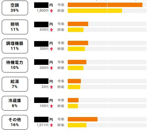 やはり、圧倒的にエアコンの使用割合が高いのですが、すべての電気使用量が昨年に比べてアップしています。電気料金自体が上がっていることもあるかもしれませんが、猛暑の影響が大きいと思います。空調の割合高いのはしかたがないとして、エアコンの使い方など電源の入り切りを頻繁にせず、短時間であればONのまま出かけたりして工夫したり、そのほかの電気使用量を抑えることは、可能だと思います。