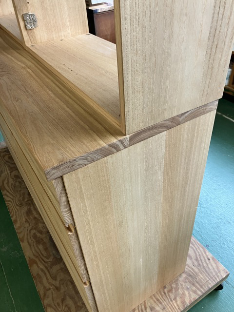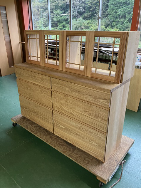 上下キャビネット部分は桐材、上段の吊戸棚の格子扉は杉材、下段のカウンターと引出し部分はタモ材