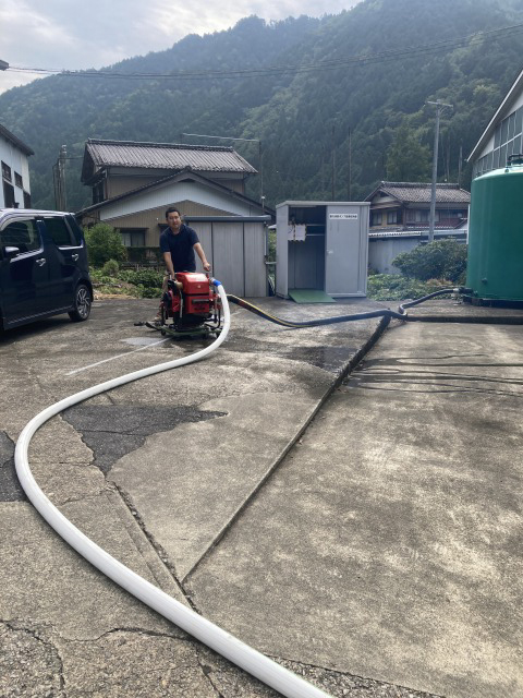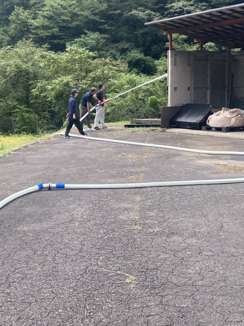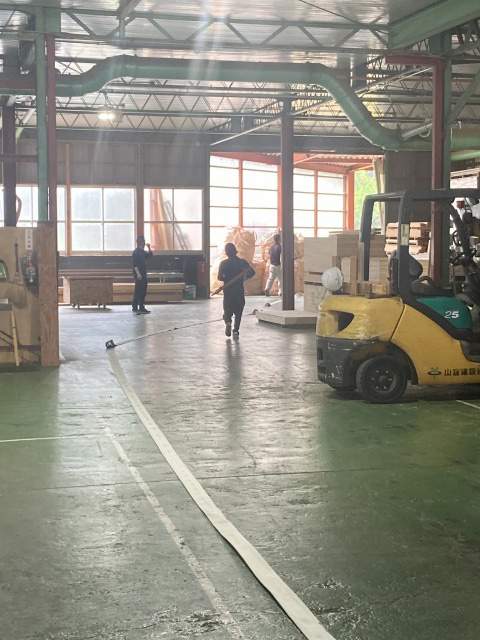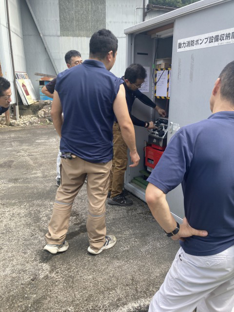 本社工場内には多くの木材がある為、もしも火災が発生したら大変な事になります。そこで年に一度消防ポンプを使用しての消火訓練を行っています。