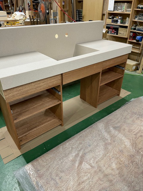 天板は人工大理石になります。キャビネットは桐材で製作しています。