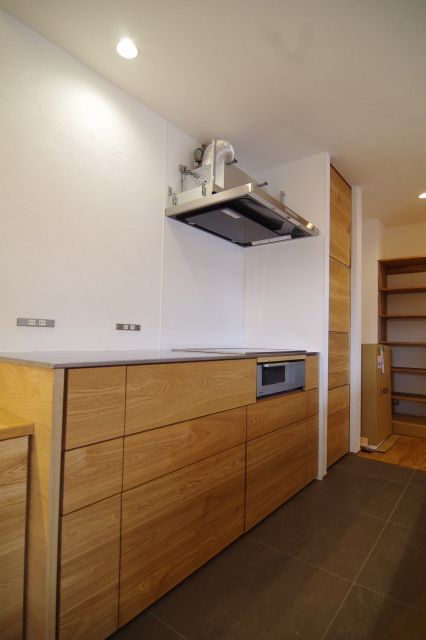 天板以外は無垢の木材を使用しますので、木目の向きや色などもお好みに合わせてお決め頂けます。一定のパターンから選んでいくメーカーさんの商品と違い、ゼロから作り上げていきますで完全オリジナルの自分だけのキッチンが出来上がります。