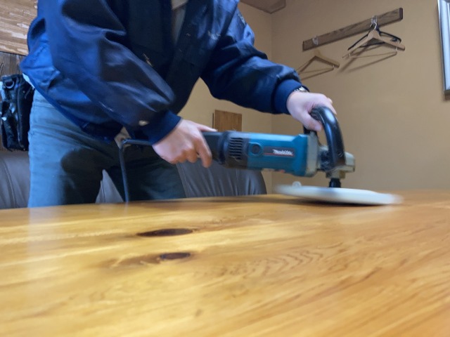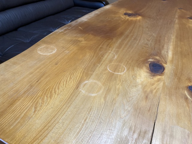 先日、事務員さんから応接室のテーブルの傷や輪じみが気になると言われ、塗り替え作業を行いました。長年の使用で傷や汚れが目立ったため、天板部分を木地の状態まで落として再塗装しました。