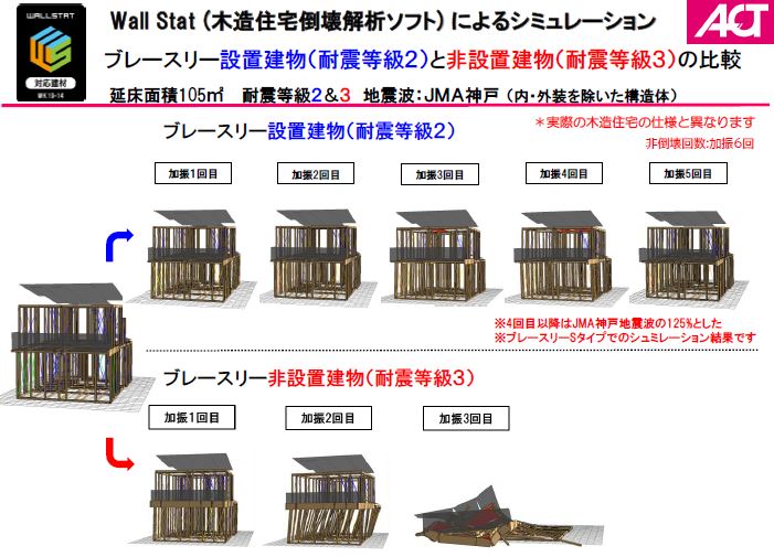 耐震等級3より耐震等級2と制震金物を併用した建物の方が、繰り返しの地震に強い結果となっています。揺れの軽減することの必要性がわかる資料になっています。