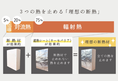 建物内の熱移動の割合はだいたい伝導熱5%、対流熱20%、輻射熱75%となりますが、一般的に使われている断熱材だけでは一番大きな割合を占める輻射熱にほとんど効果がないのです。そのため弊社では断熱材+サーモバリアを使用することで3つの熱全てを止めることが可能になり、理想の断熱を実現できているのです。