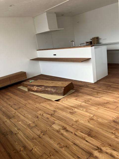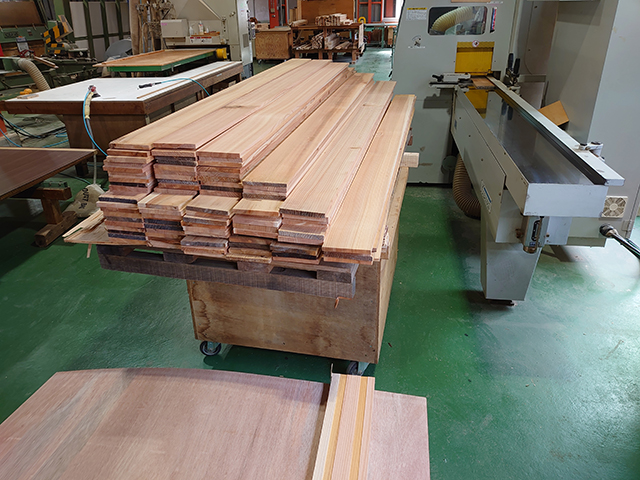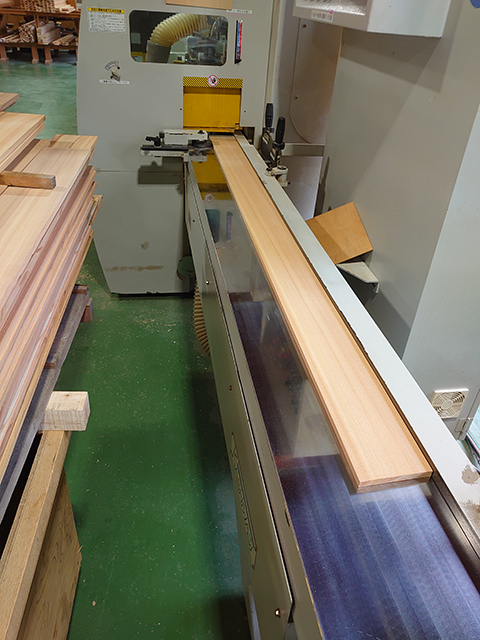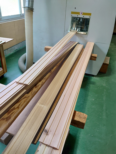 今回は工場の製材で挽いた材を7軸モルダーを使って加工ました。