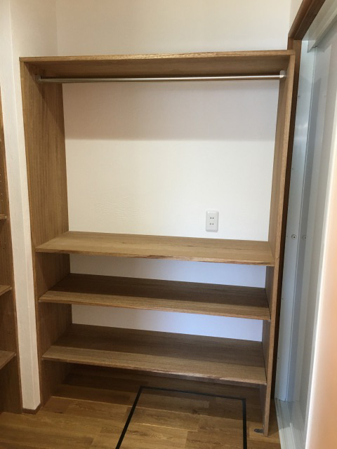 オープンタイプの収納ですが、上段にはハンガーパイプ、