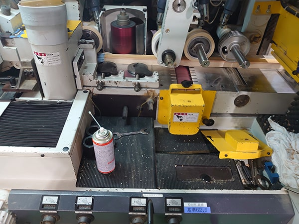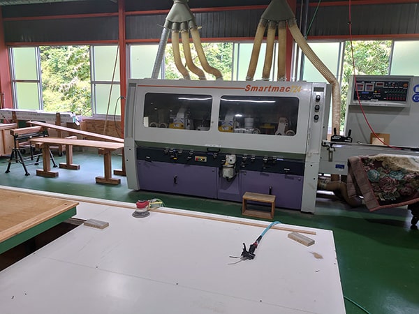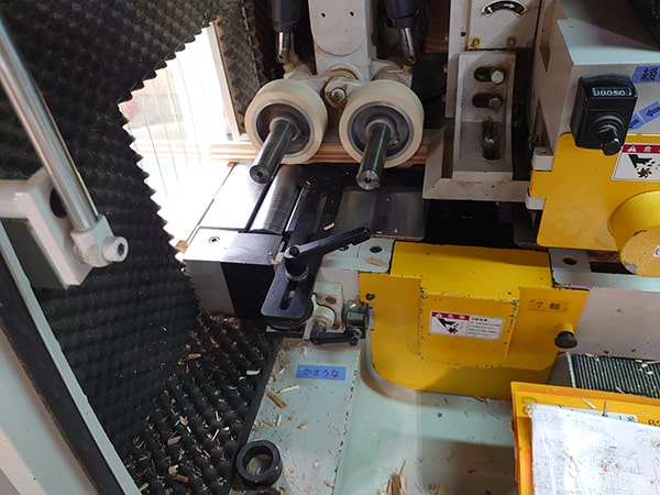 複数の刃物回転軸を持ち、それぞれ刃物をセット、調整することで、機内を材料が通るうちにカンナ削りや溝付き加工、面取り加工を連続して行うことができます。