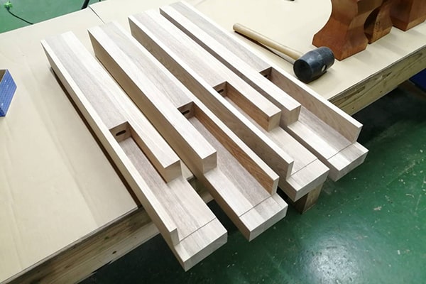 図面通りに足を加工します。木目の美しい、良質なタモ材を使用しました。