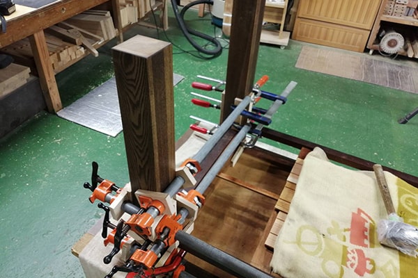 クランプを駆使して接着します。異樹種どうしの接着に強い、ピーアイボンドを使用しました。