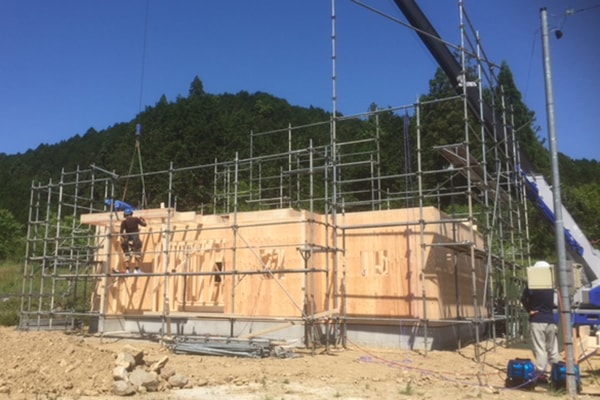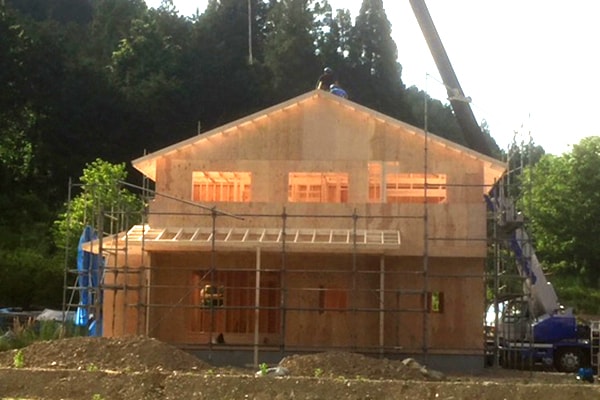 ツーバイフォーは湿気が大敵なので、湿気が入らないようパネルを一気に組み上げていきます。