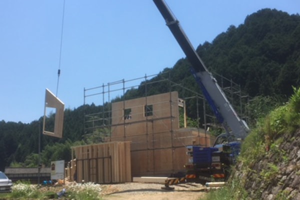 クレーンでパネルを吊り上げ、組み立てていきます。