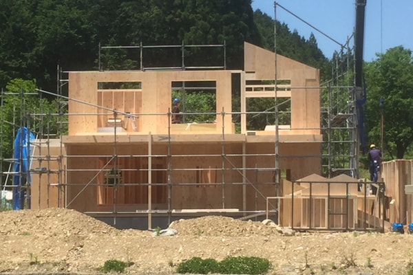 ツーバイフォーのパネルはパネル工場で製作され、現場で組み立てていきます。