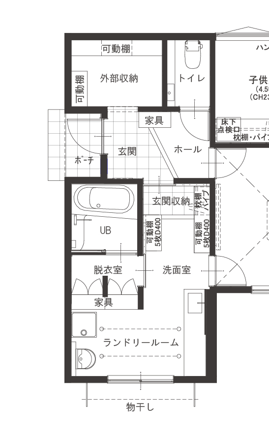 勝手口を出たところに外に物干しスペースを設ければ、外干ししたい時に便利です。