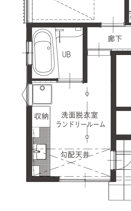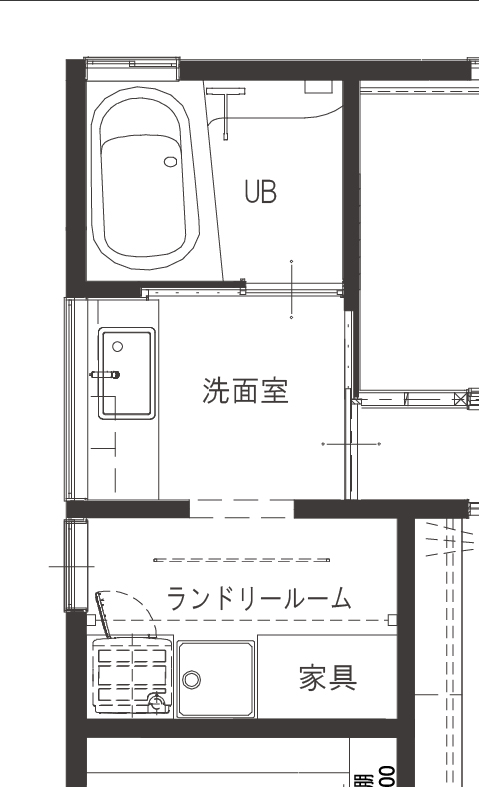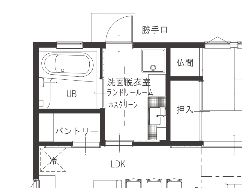 ↑洗面脱衣室を兼ねた3畳のランドリームです。洗濯機の横には勝手口があります。洗濯を畳むこともできる造作で作られた収納が便利です。