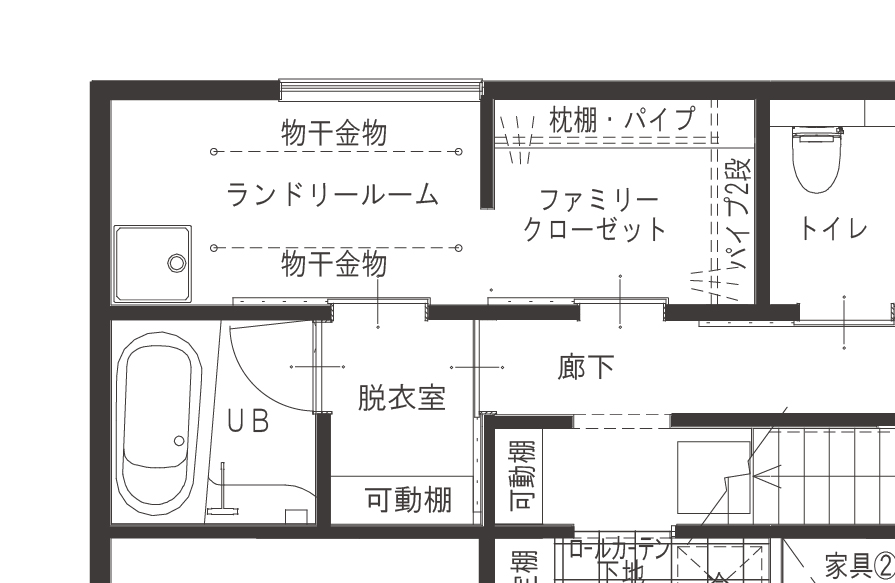 吹き抜けがあれば、2階ホールに物干しスペースを設ける