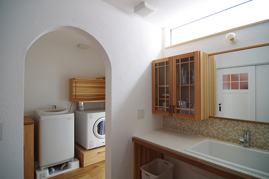 ↑奥様こだわりの洗面、脱衣室、ランドリールームをを兼ねた、約6畳の広い空間です。テラスにも出ることができ、とても便利です。壁・天井が漆喰なので部屋干しでも良く乾き、臭いも気になりません