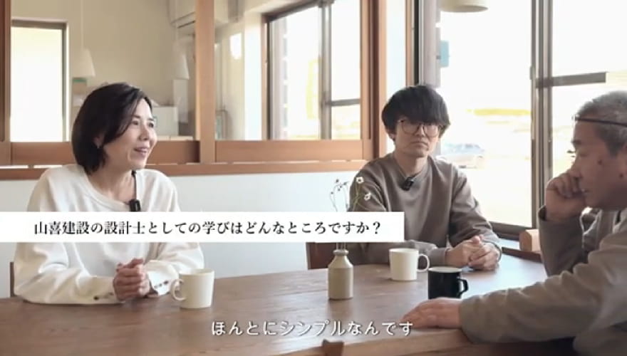 山喜建設の建物自体が自然素材でできているので、ほんとシンプルなんです。無垢と漆喰の真っ白っていう、地味なように思うんだけれども、すごく素敵なお家になるっていうのが山喜の特徴かなと私は思ってて、私が設計をそんなに作り込まなくても、お客様の方で色を添えてくれる。設計士が「私が設計しました」って胸を張らなくても素敵なお家ができるんだっていうのが、 私が山喜で学んだということですね。