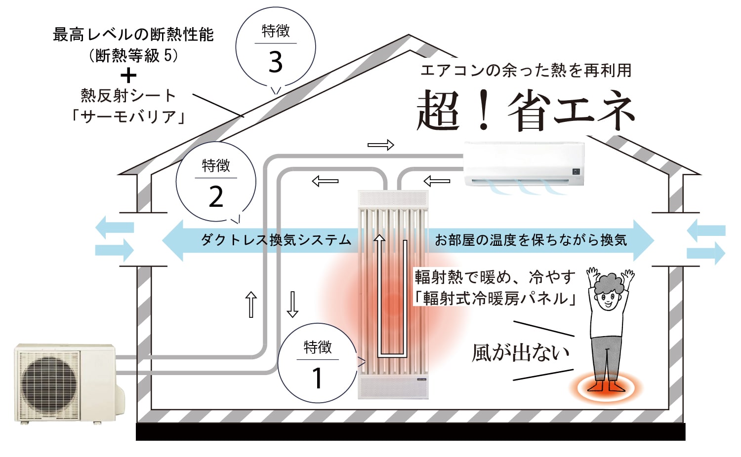 “風の出ない”輻射式 冷暖房パネルは、エアコンの出し切れず余った熱をパネル内に送り再利用することで、全館暖房を実現します。