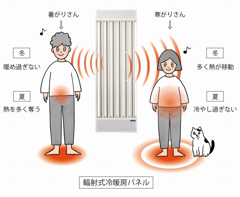 遠赤外線は温度の高い方から低い方へ熱が移動するので、輻射式は家も人も温度を均等にし、暑がりさんも寒がりさんも同時に快適温度に調整してくれます。