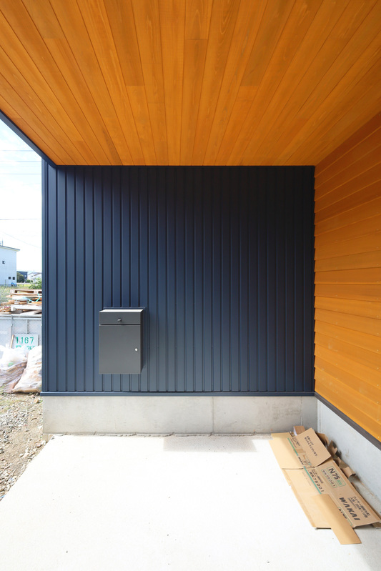 サイクルポート(駐輪場)の一部はガルバリウムを横張りにし、玄関周りには杉板を張ることでアクセントにしました。