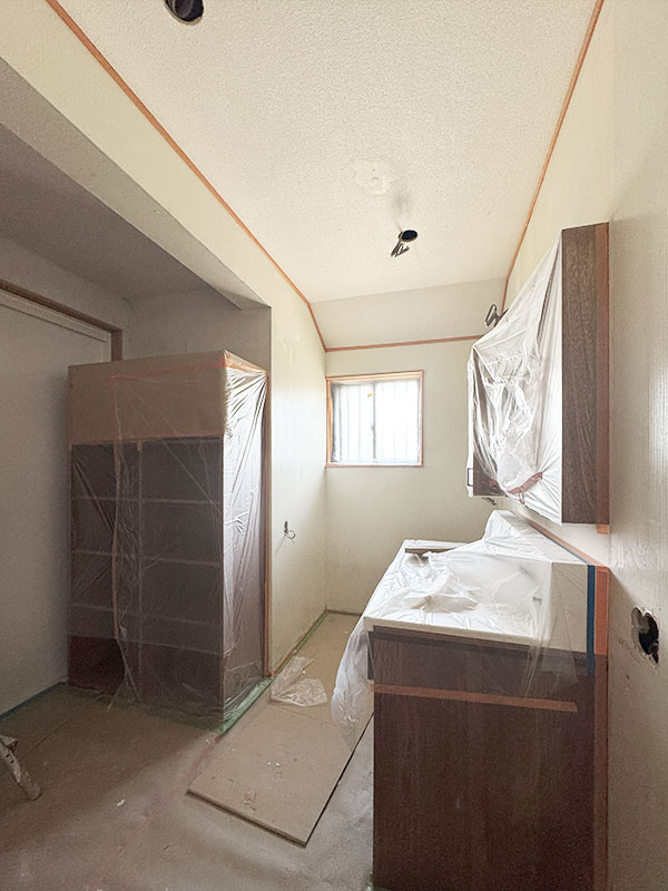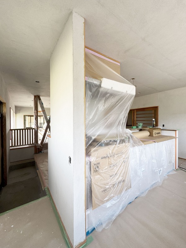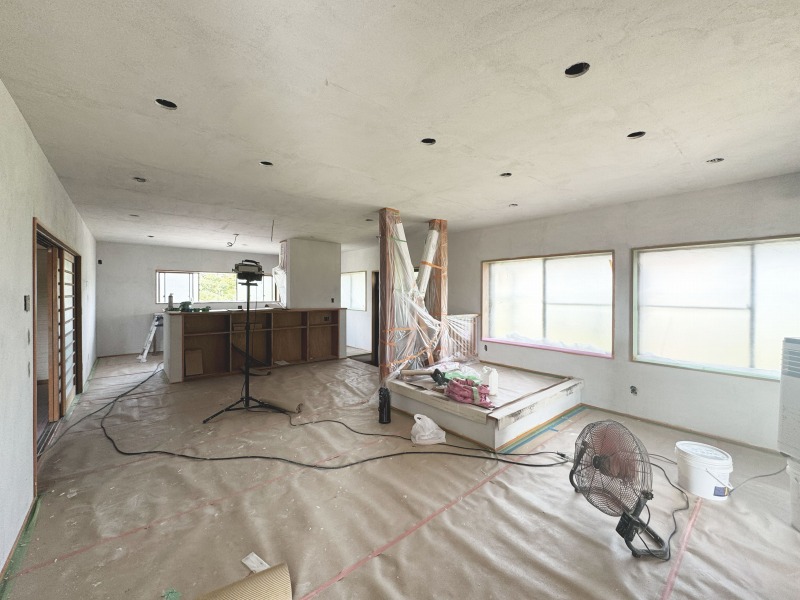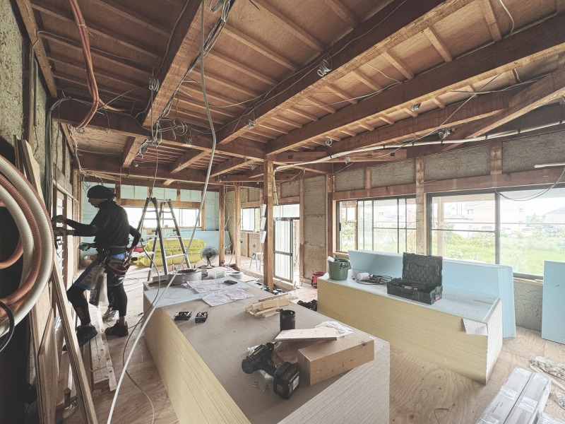 あたらしい壁を造作しこれから漆喰が塗られていきます。漆喰を塗ると明るい空間になります。床は無垢フローリングを採用し、リノベーション後も自然素材の優しい空気感に包まれます。