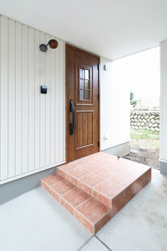 店舗側の木製扉や玄関前のタイルもこだわりました。