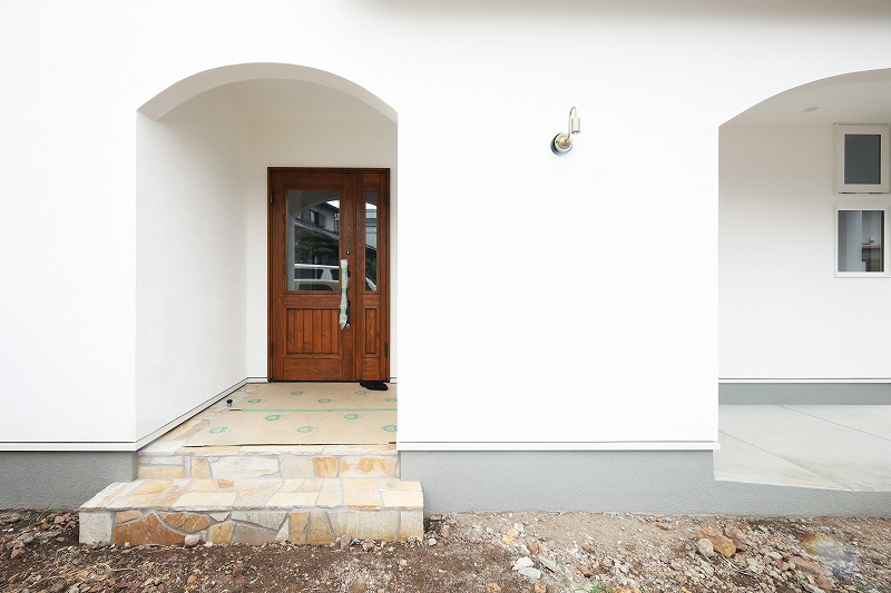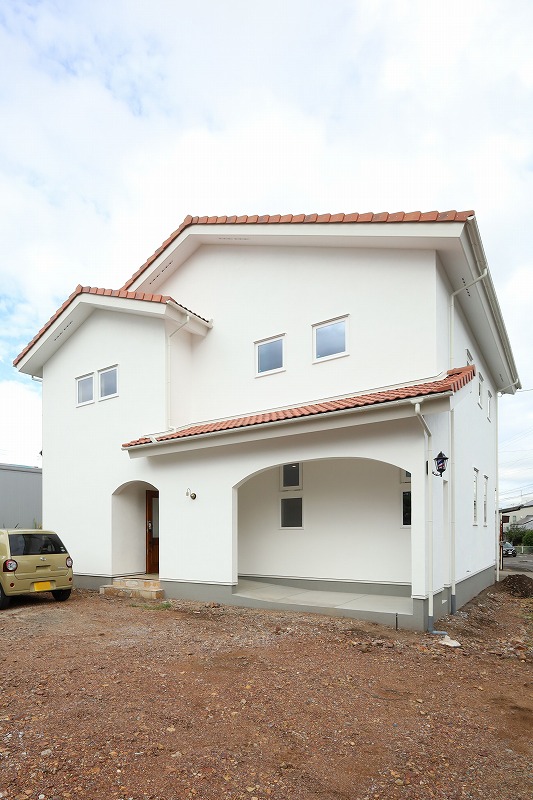 外観の前面は漆喰、南面と西面はホワイトのガルバリウムにしました。屋根はレンガ色の瓦を選びヨーロピアンな雰囲気の建物になりました。