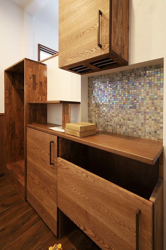 背面収納の壁には、店舗や玄関にも使ったモザイクタイルを貼りました。
