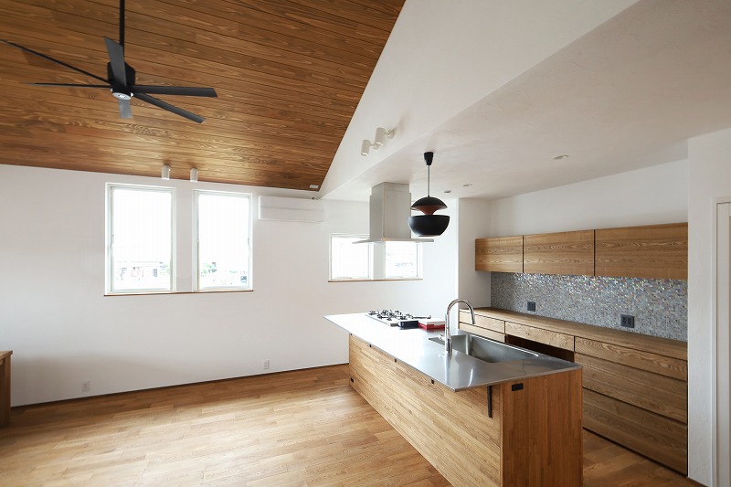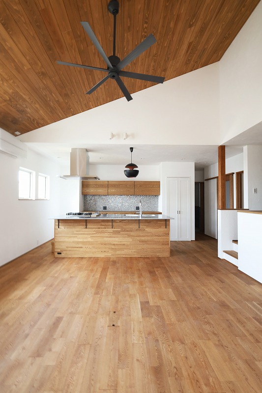 階段を上がると約23帖の広々としたLDKが現れます。壁は漆喰、勾配天井は杉板貼り、床はナラ無垢です。