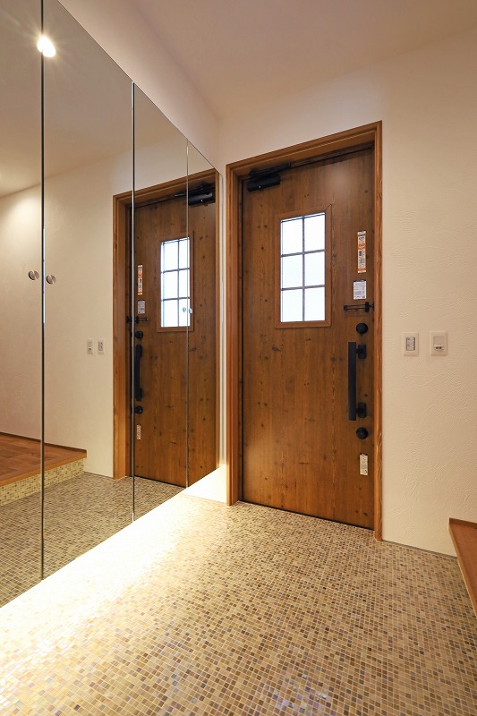玄関を開けるとモザイクタイル貼りの玄関を間接照明が照らします。
