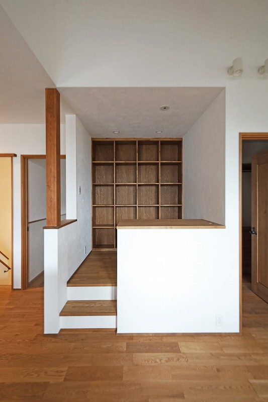 LDKの一角には小上がりの書斎スペースがあり背面の本棚もオーダーメイド家具です。