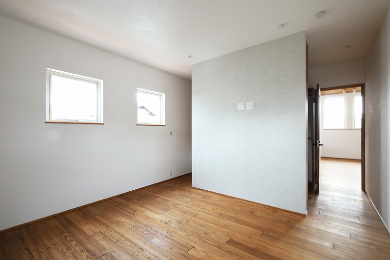 漆喰を壁紙に間には無垢で見切り材を付け高級感のある仕上がりになりますね。