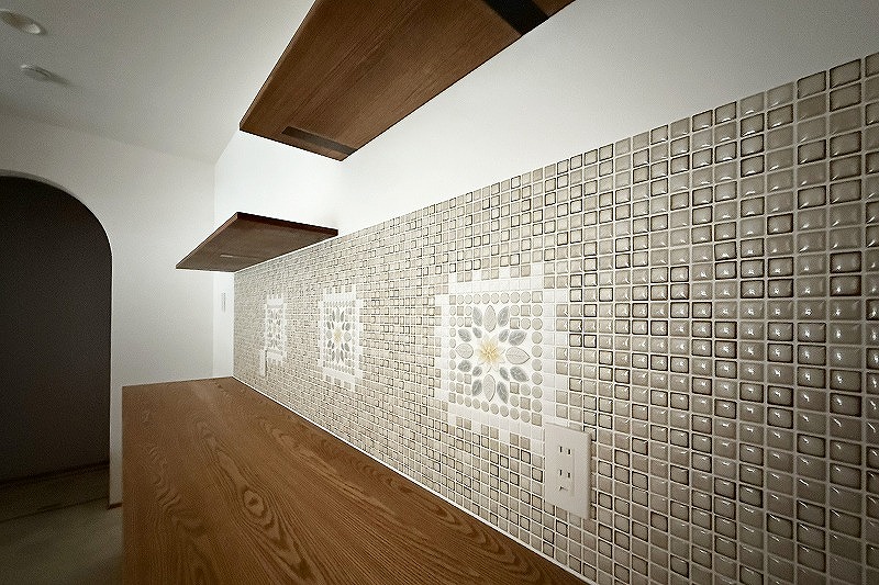 キッチン背面収納の壁にはお施主様こだわりのタイルを貼りました^^