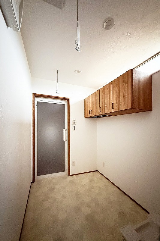 LDKの北側は水廻りがまとまっています。脱衣室の吊戸棚もオーダーメイド家具。扉を開けずに下からタオルが取れるよう設計し作りました。