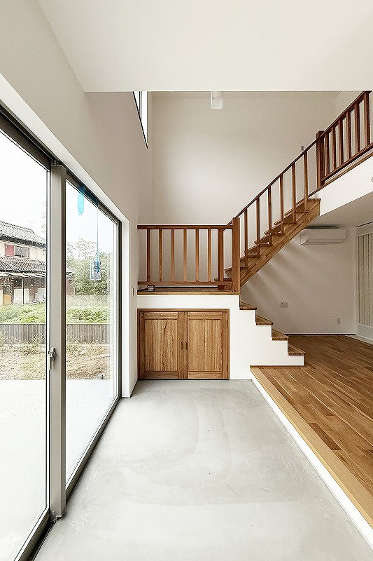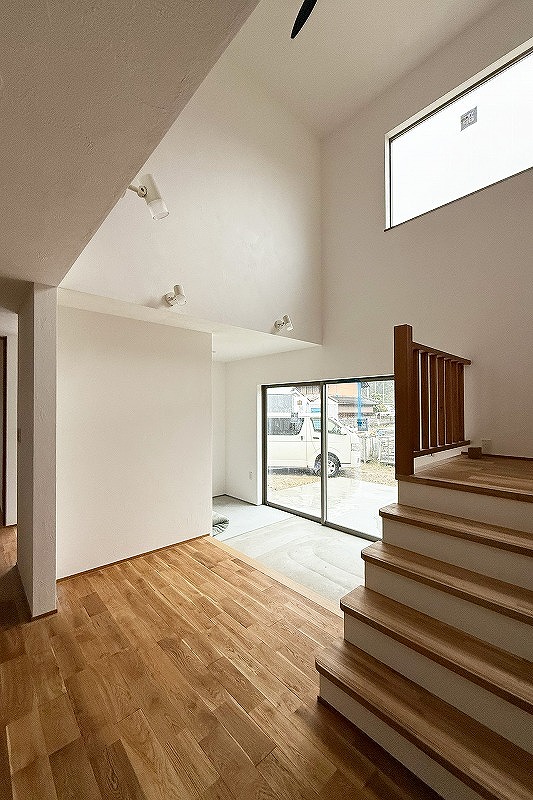 階段の吹き抜けとつながった広い土間空間。土間は仕切りなしでリビングとつながることで空間に解放感をもたらしています。高窓とテラスにつながる大きな掃き出し窓からの明かりでとても明るいですね^^壁・天井は漆喰、床はナラ無垢です。