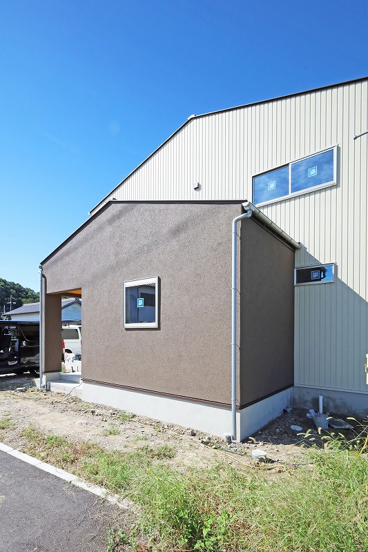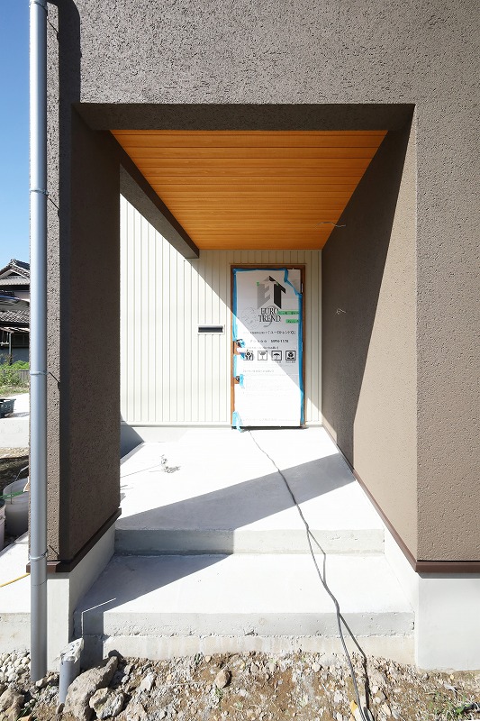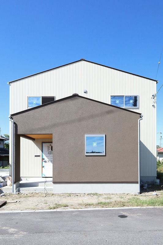 外観はアイボリーのガルバリウムとグレイッシュな色合いのジョリパッドを組み合わせました。玄関ポーチの軒天は杉板を貼りアクセントにしました。