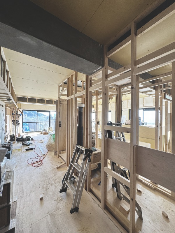 まだまだ大工工事中ですが、内観は落ち着いたベージュの漆喰を採用、家具のほとんどは本社工場でつくられるオーダーメイド。寝室は個室にせず、建具で仕切りより空間を広く見せ、また、マンションでは少なくなりがちな収納をたくさん設けました。