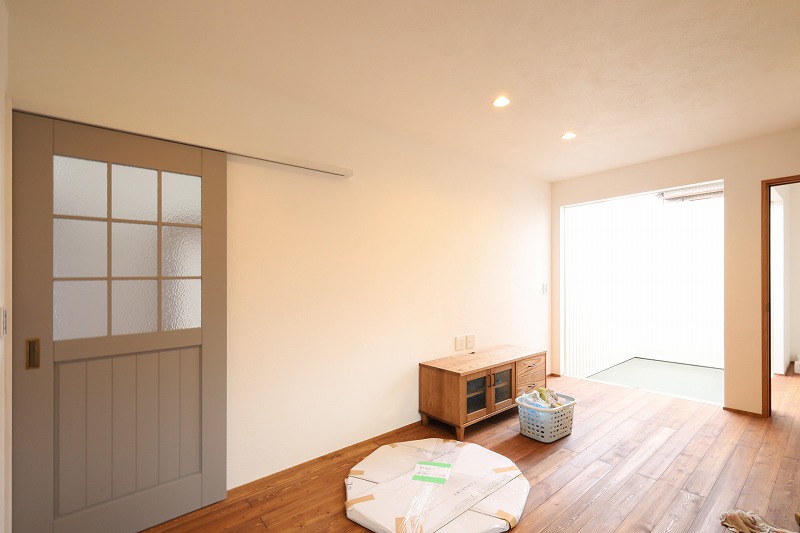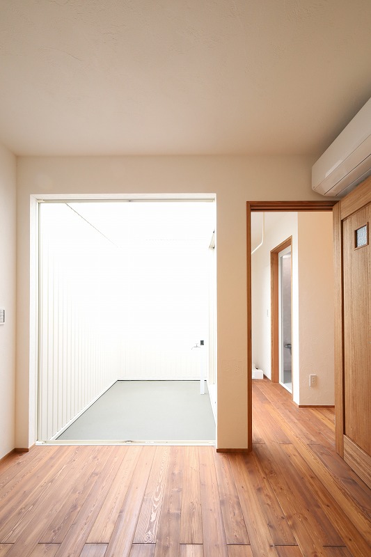 LDK横の中庭はガルバリウムで囲いプライベートな空間に^^LDK側と、洗面物干し側にも掃き出し窓を設け採光を確保しました。