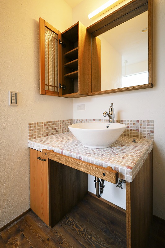 オーダーメイド家具の洗面台は自社で製作するので収納の大きさ等も自由自在です^^右側のスペースには棚があるので乾いたお洗濯物をサッと片づけることができます。