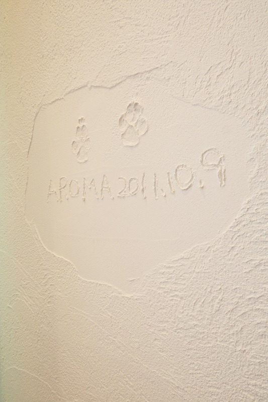 リビングには一緒に暮らすわんちゃんの手形を取りました^^大切な家族との思い出をカタチに残せるのは漆喰ならではです。ペットを飼っていると合板フローリングのほうがいいんじゃないの…?と思われる方がみえるかもしれませんが無垢や漆喰は自分で簡単にお手入れすることができるのでペットと暮らす方にもオススメです^^