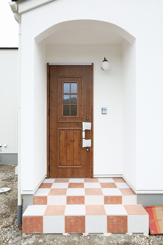 玄関ポーチのRの垂れ壁と窓モールがアクセントになっています^^土間タイルは3種類をmixし貼り方もこだわりました。