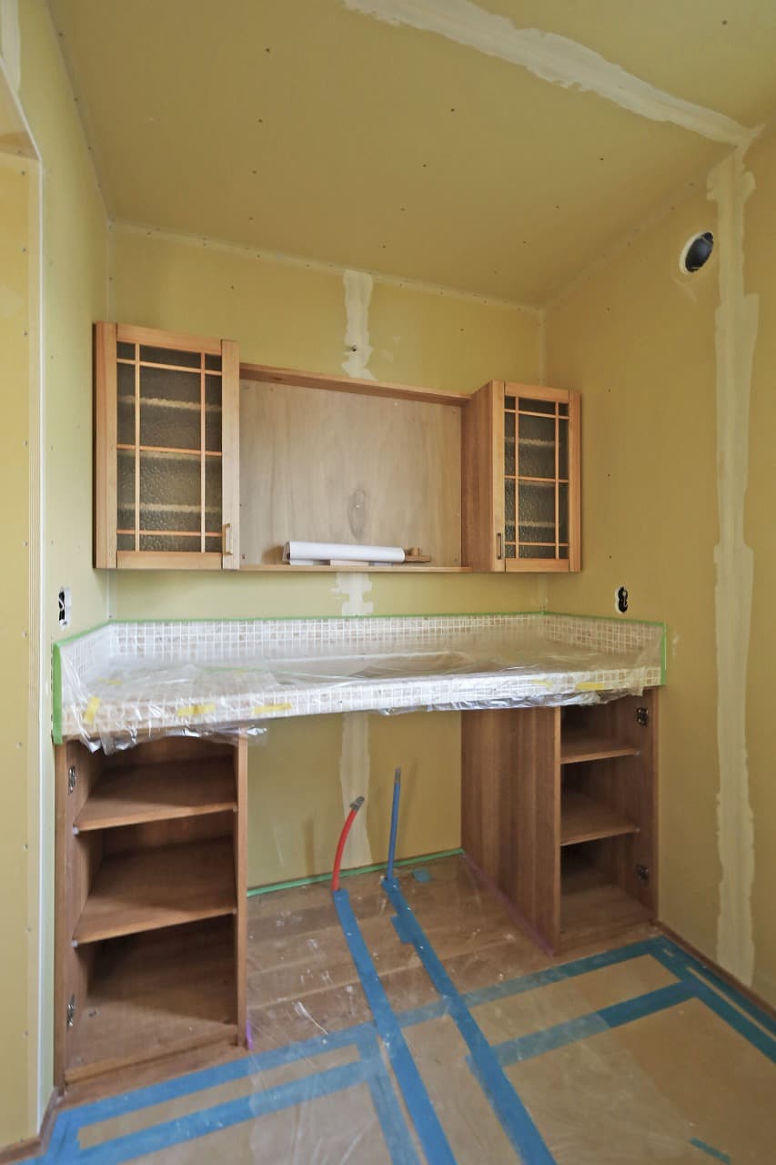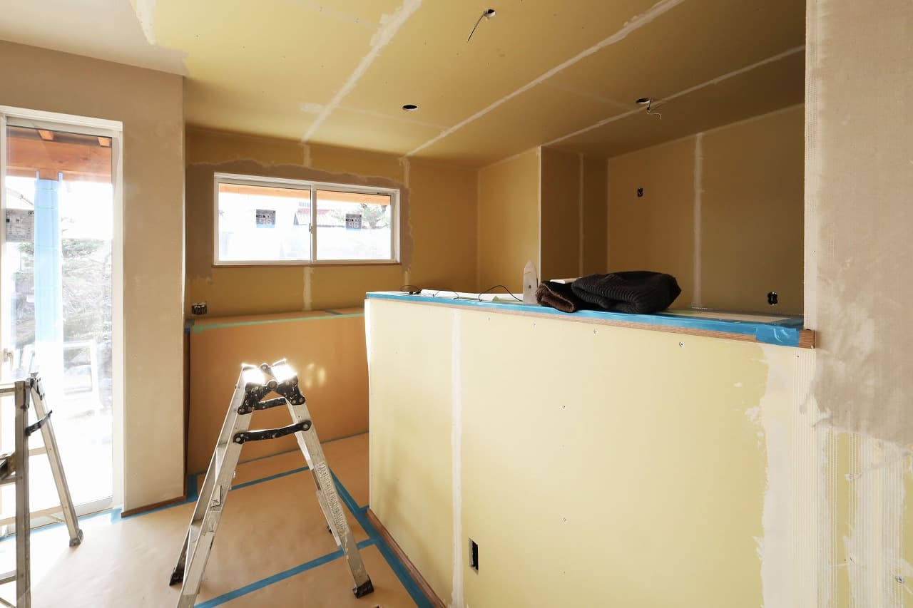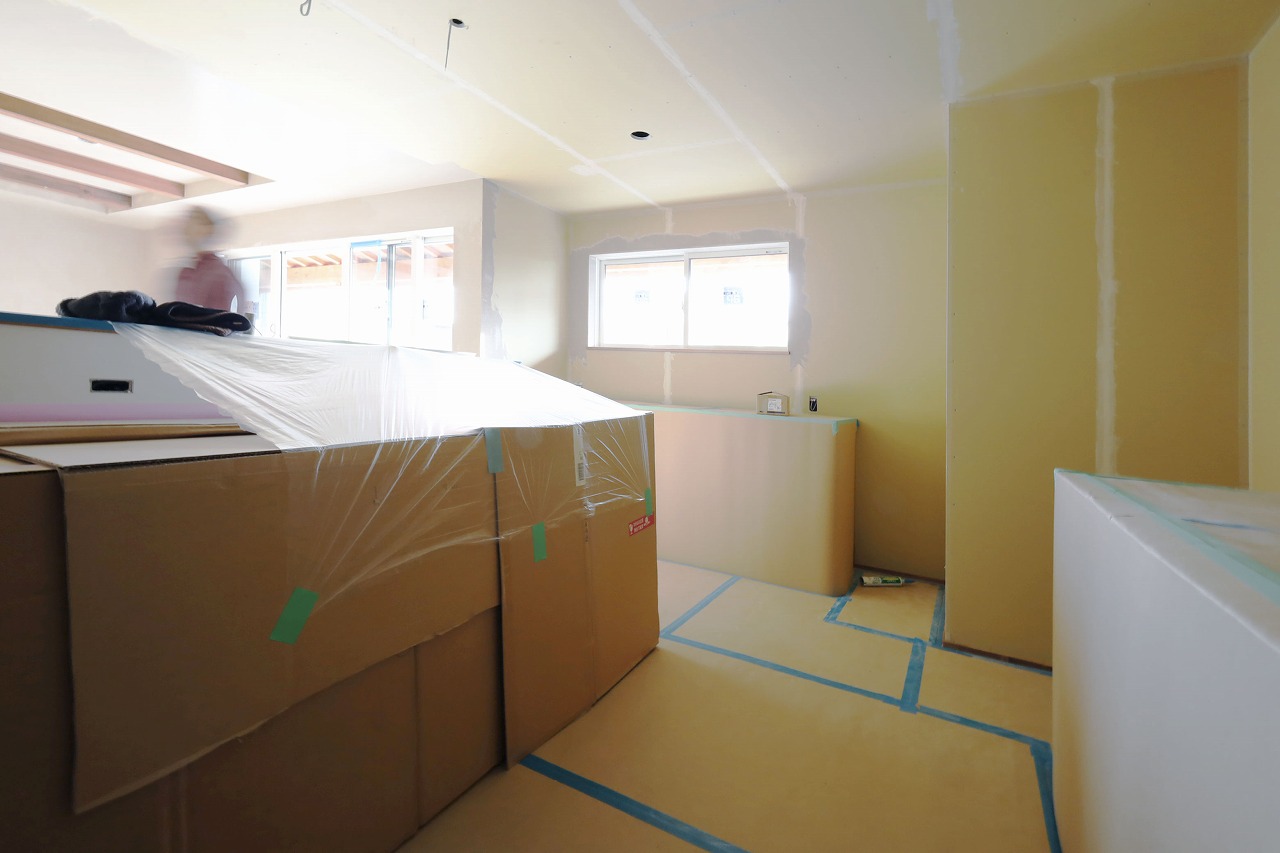 養生でまだ見えませんがキッチン背面収納とダイニング収納は弊社のオーダーメイド家具です^^