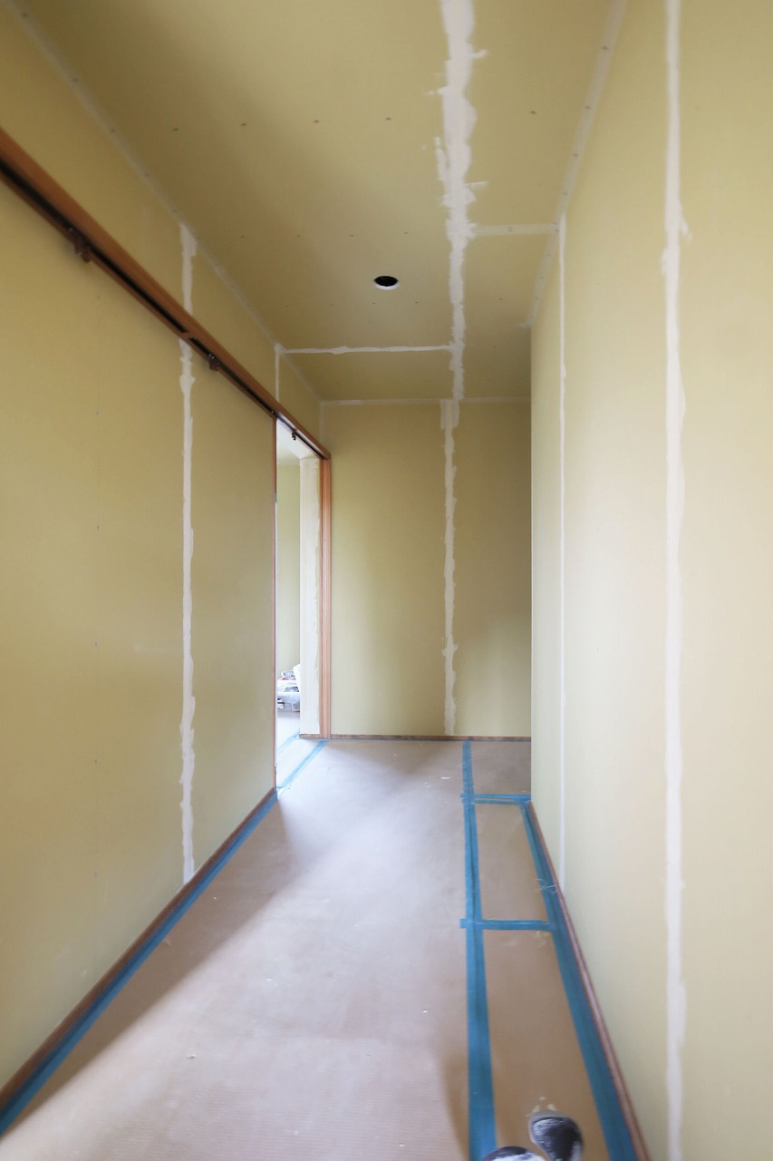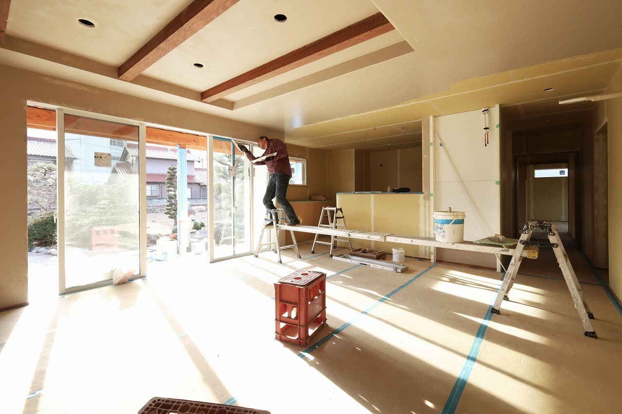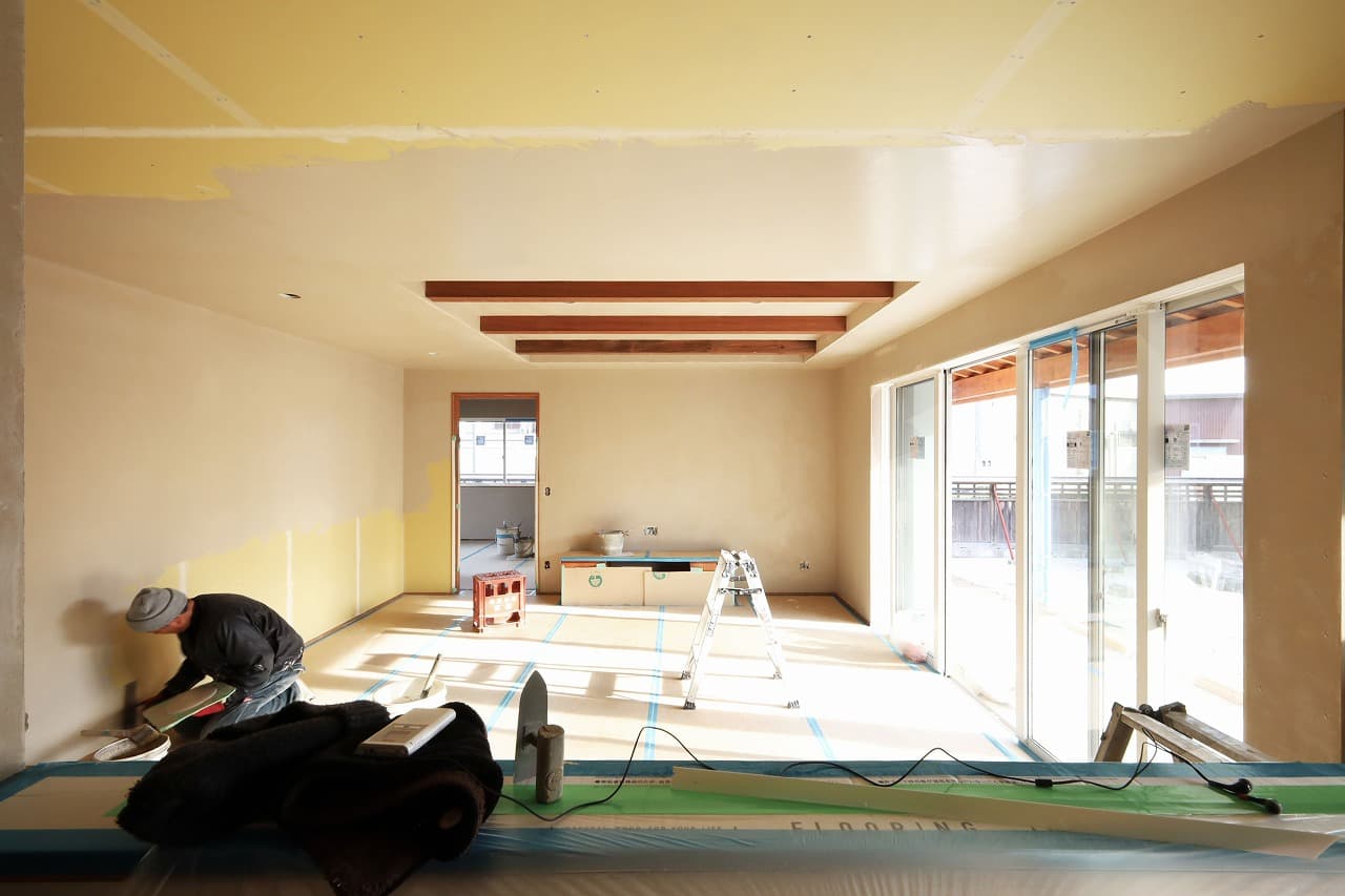 まだ施工中ですが内観もご紹介。24帖の広々としたLDK。床はナラ無垢、壁・天井は漆喰が塗られます。LDKに設置される輻射式冷暖房パネルは一台のエアコンと連携し、輻射熱で暖め冷やすので体に優しくエアコンが苦手な方におすすめ。特に冬はエアコンの風で肌や、喉が乾燥する…暖房の風に当たるのが不快…といった悩みを解消してくれます^^