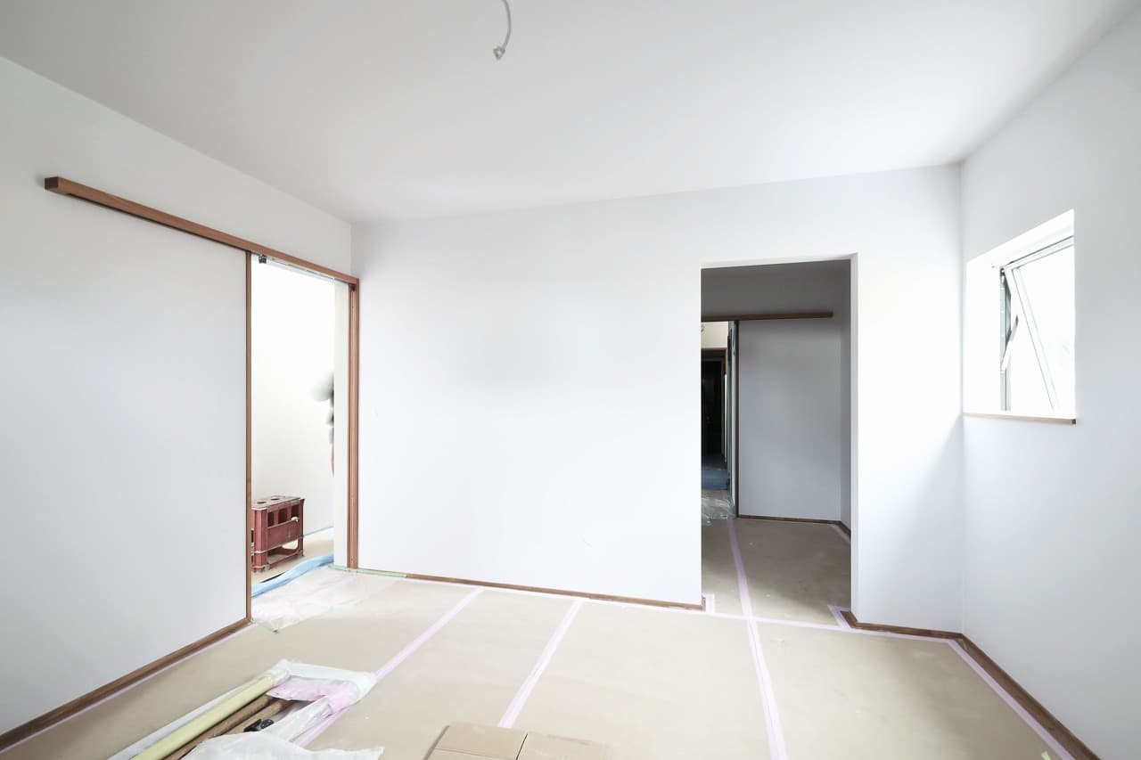 リビングの東側には多目的に使える和室を設けました。建具で仕切れば個室としても使えるので、急な来客対応なども可能なプラスアルファのお部屋として活躍します。こちらの天井はアクセントで杉板を貼りました。