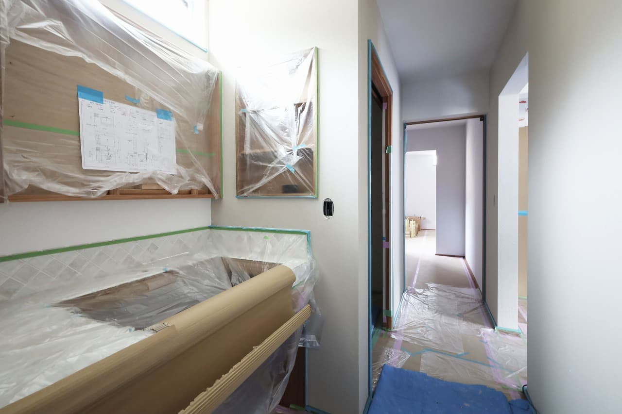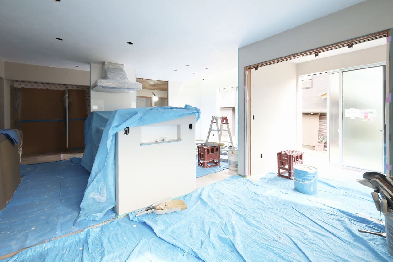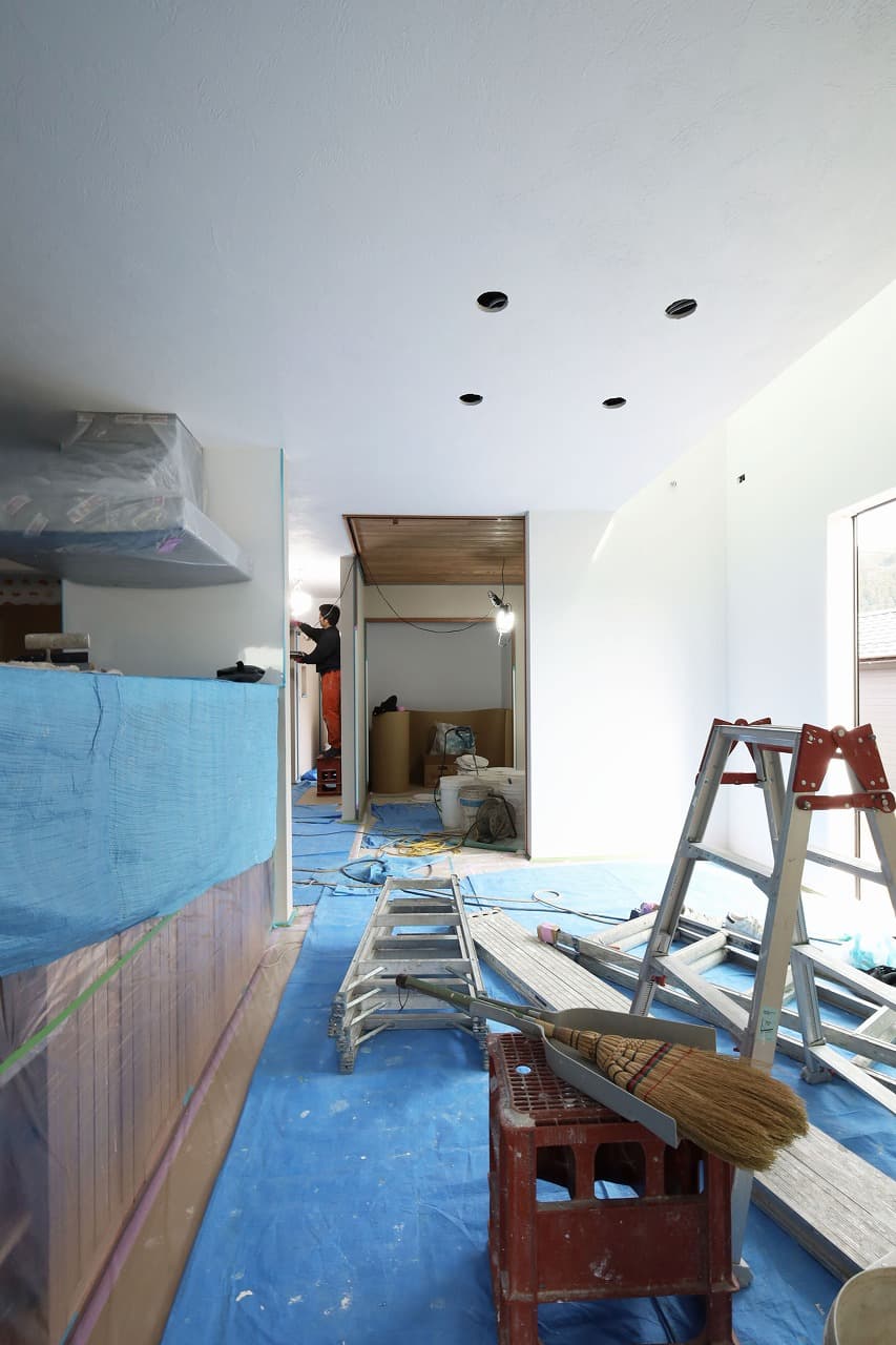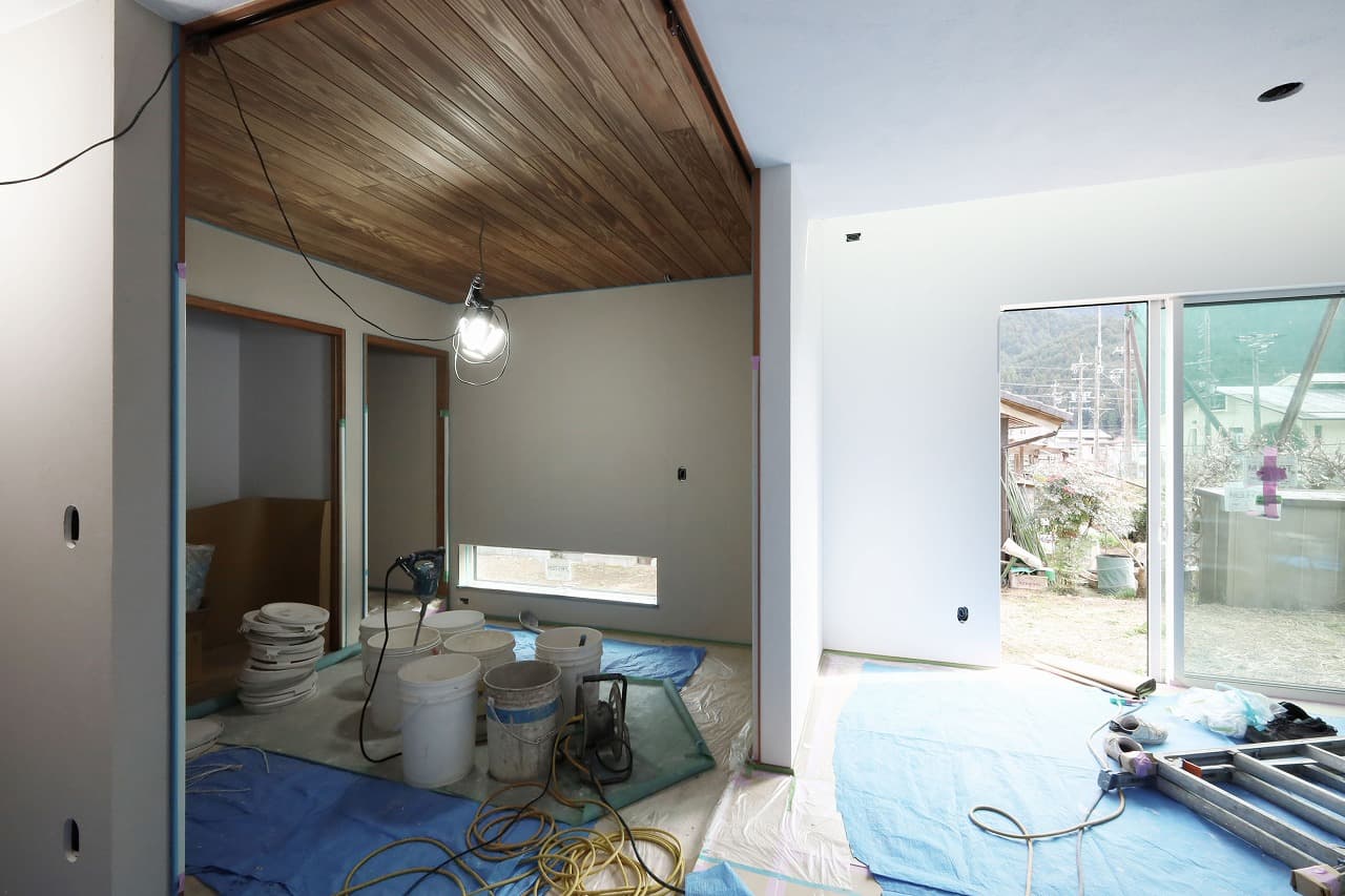 まだ建設途中ですが内観もご紹介^^キッチンを中心とした約20帖のLDK。床はパイン無垢、壁・天井には漆喰が塗られます。LDK横にはサンルームを設けました。雨の日でも花粉の酷い時期でも気にせず洗濯物を干せる実用的なスペースです。