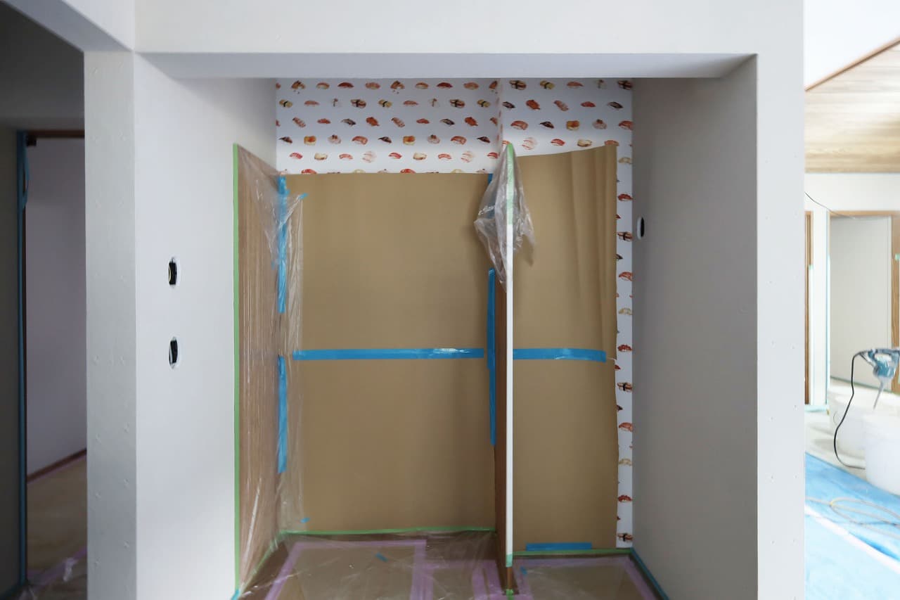 キッチン横に設けた大容量のパントリーはカーテンで仕切りを付けます。アクセントクロスはなんとお寿司柄!^^かわいいですね^^
