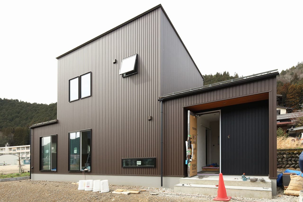 全体はコーヒー色のガルバリウムに玄関廻りのみブラックでアクセントにしました。玄関の軒天は杉板を貼っています。