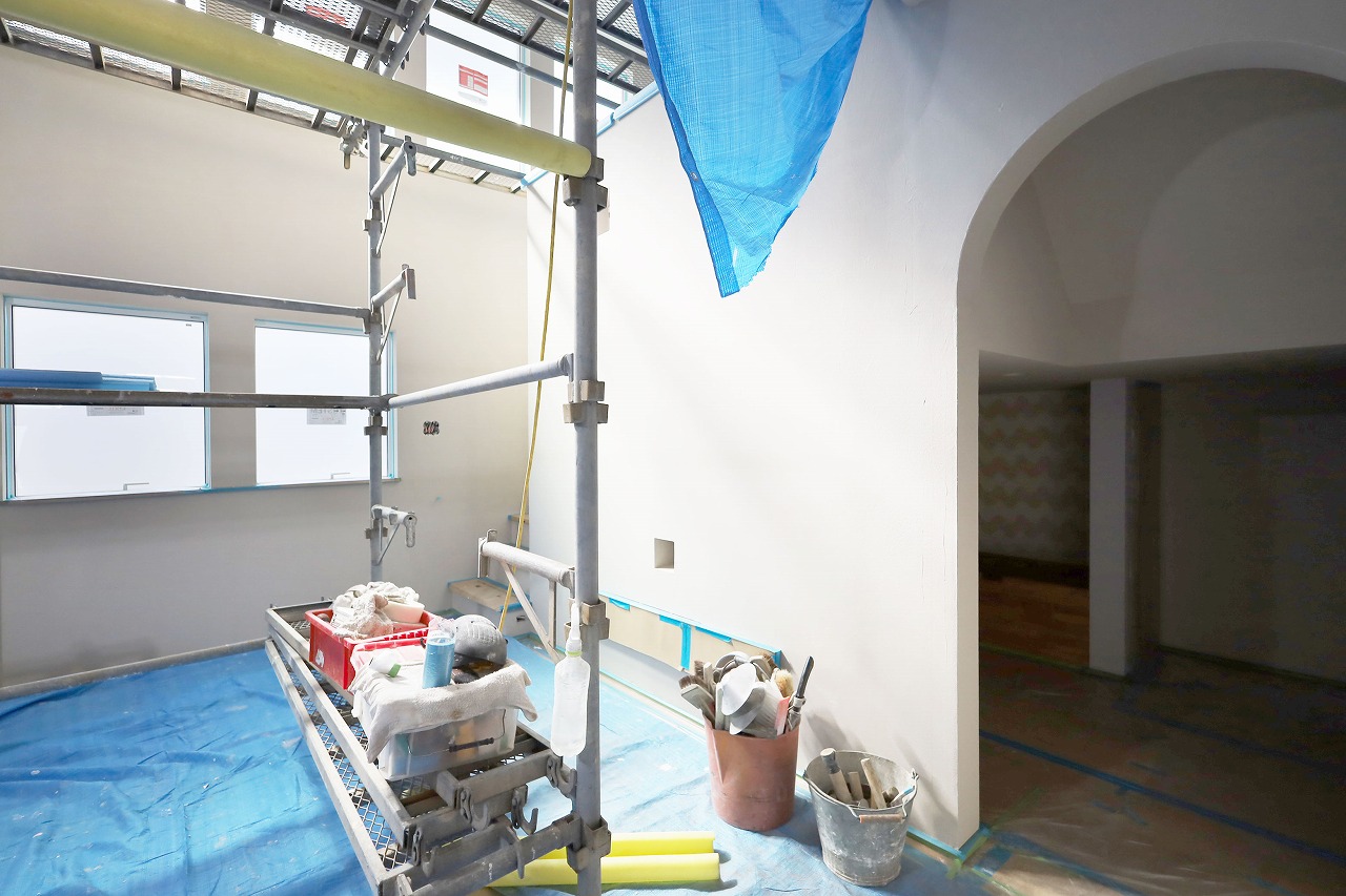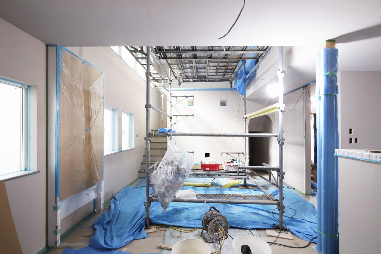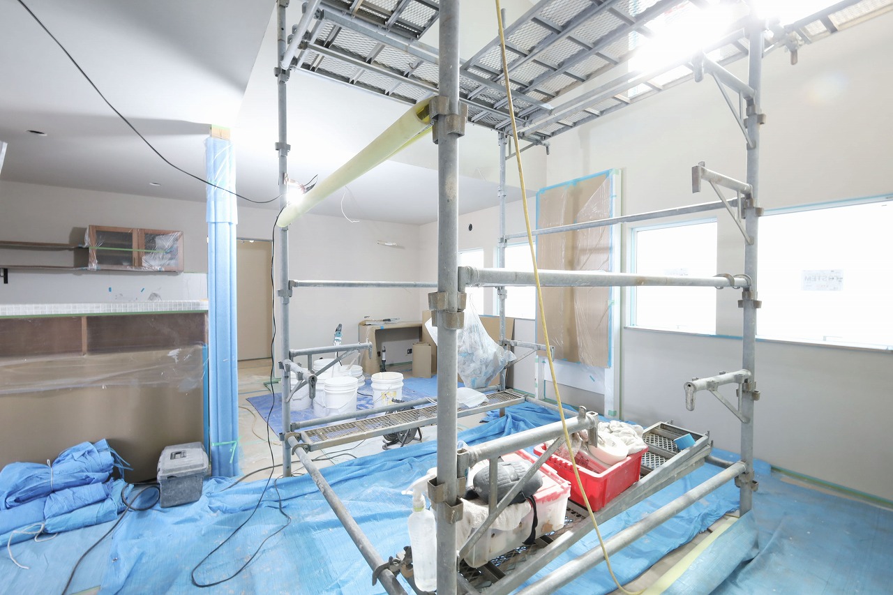 まだ建築途中ですが内観もご紹介^^約22帖のLDK。床はナラ無垢、壁・天井には漆喰が塗られます。こちらのお住まいは輻射式冷暖房パネルを採用。輻射熱で暖め冷やすので、エアコンの苦手な人におすすめ!