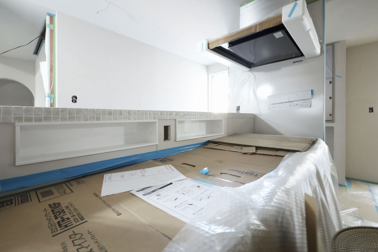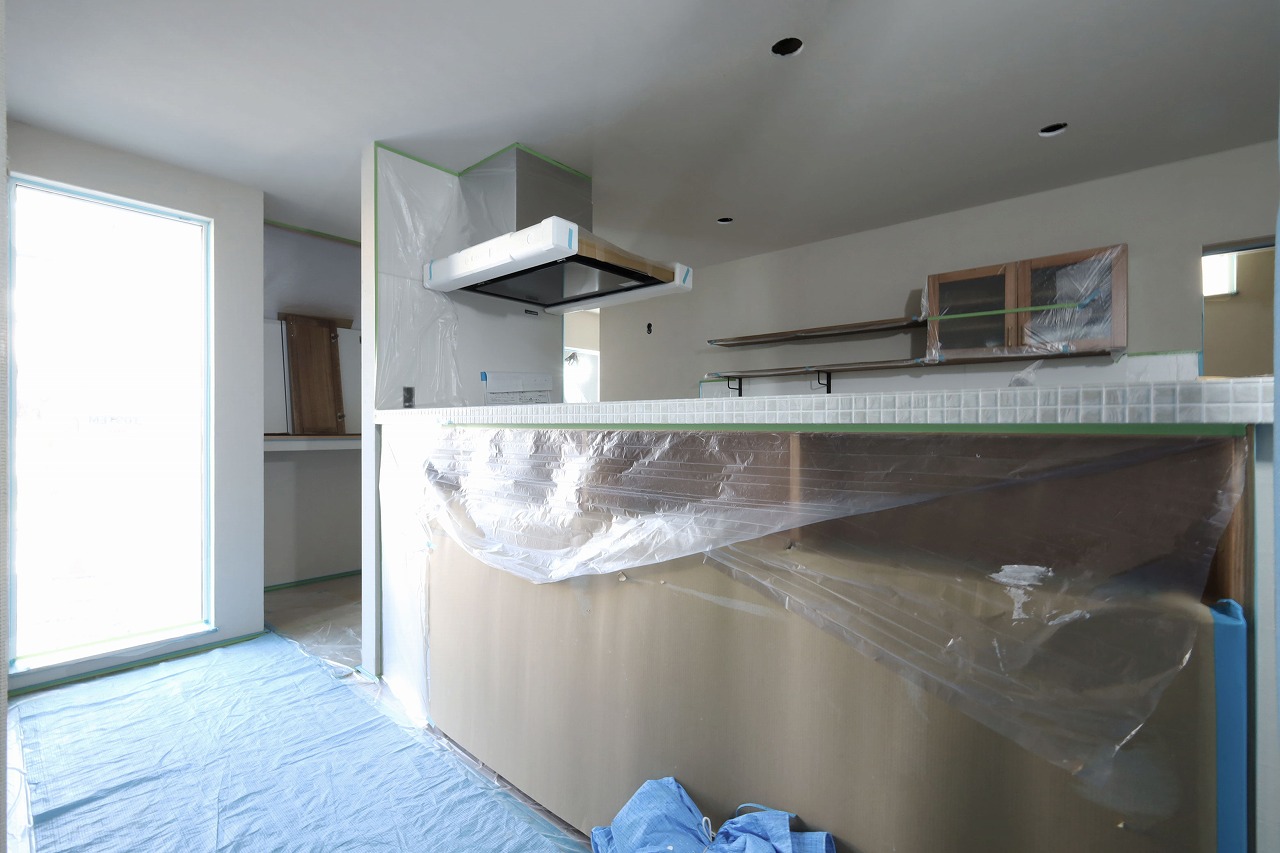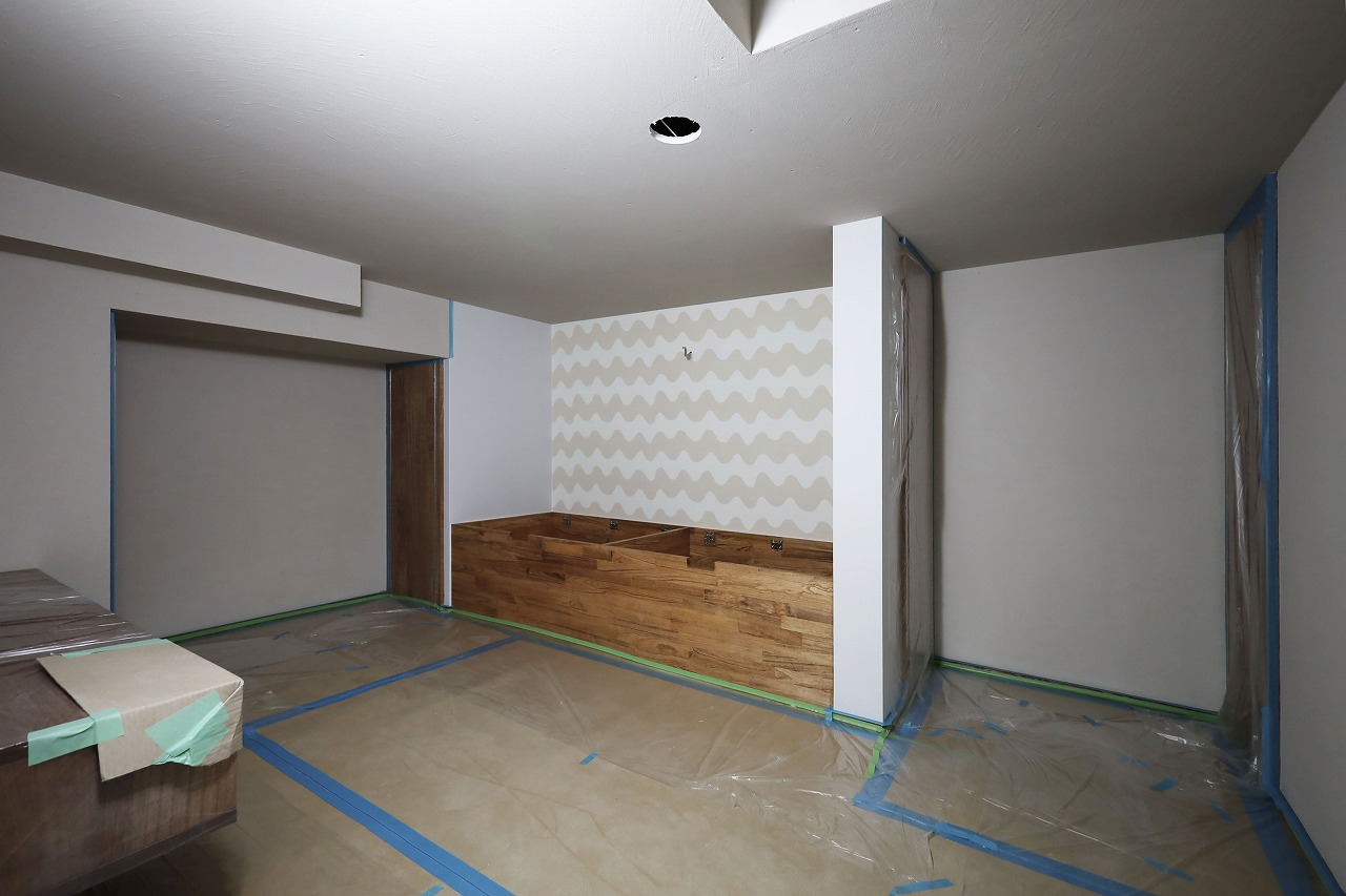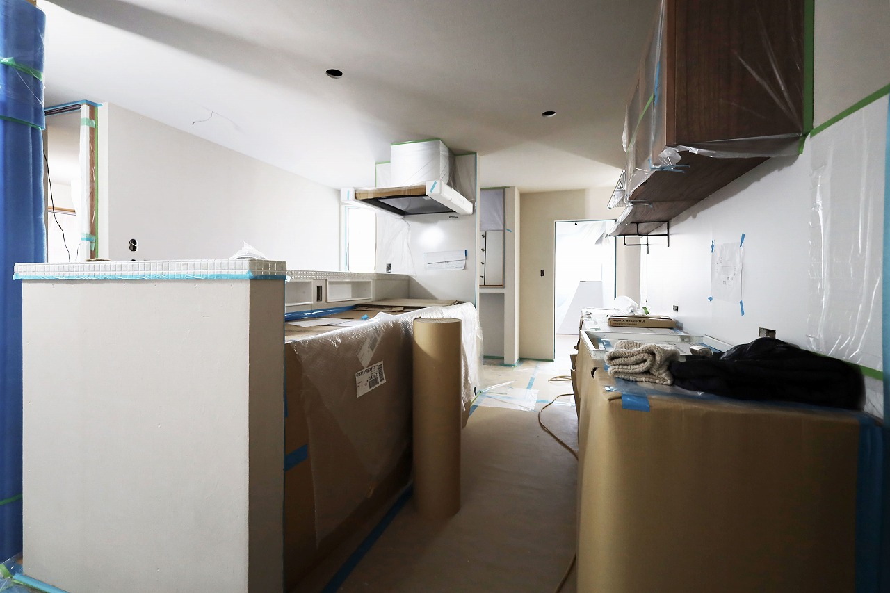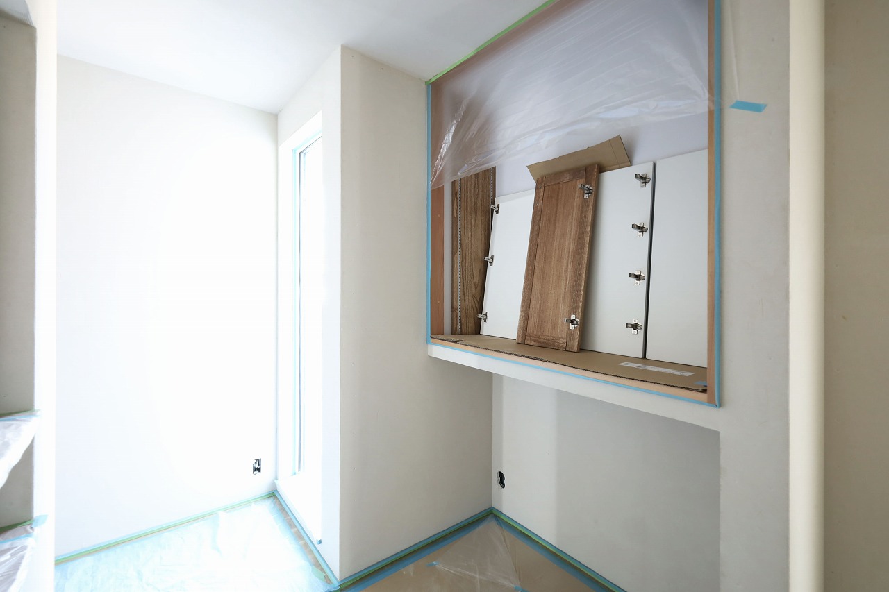 まだ見えませんがキッチンの腰壁にはリビング収納にもなるオーダーメイド家具を作りました。